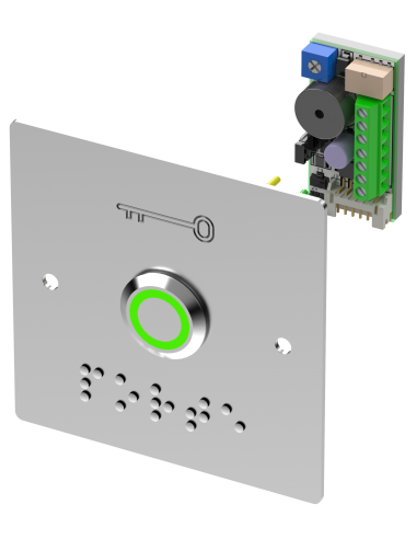 Bouton poussoir inox avec plaque d'encastrement et braille porte led bicolore Sewosy PB19VB_BBL. Avec buzzer et temporisation de 0 à 60 s. Ce bouton poussoir lumineux est doté de la nouvelle signalisation vert/blanc propre à Sewosy. Monté sur plaque inox, avec marquage, il est adapté à la directive PMR. Le montage peut s'effectuer en applique ou encastré.